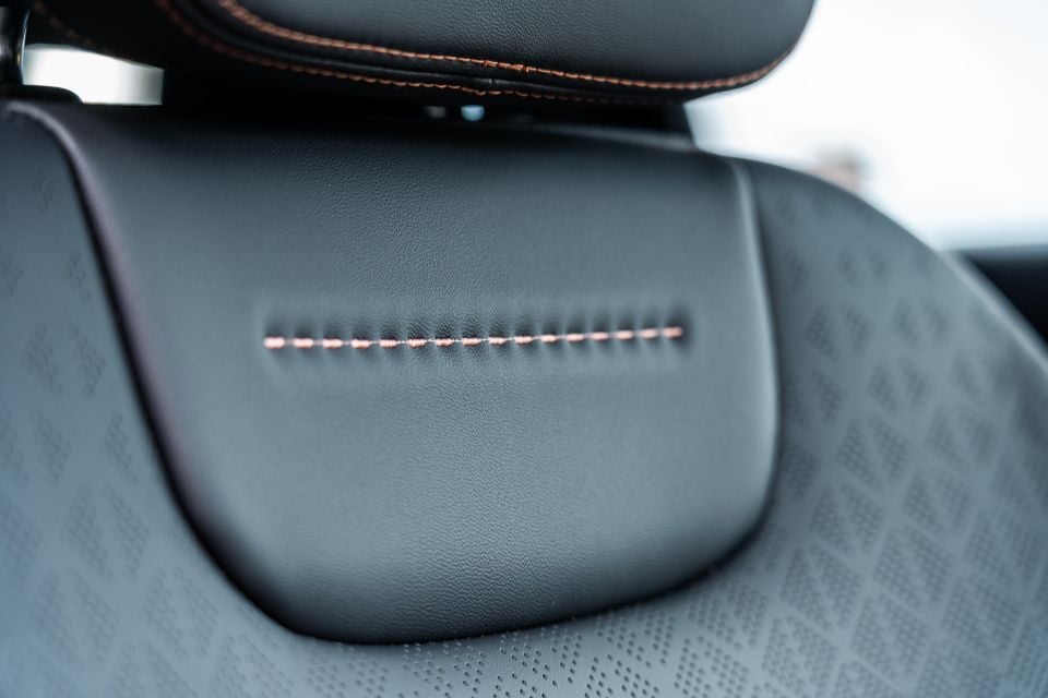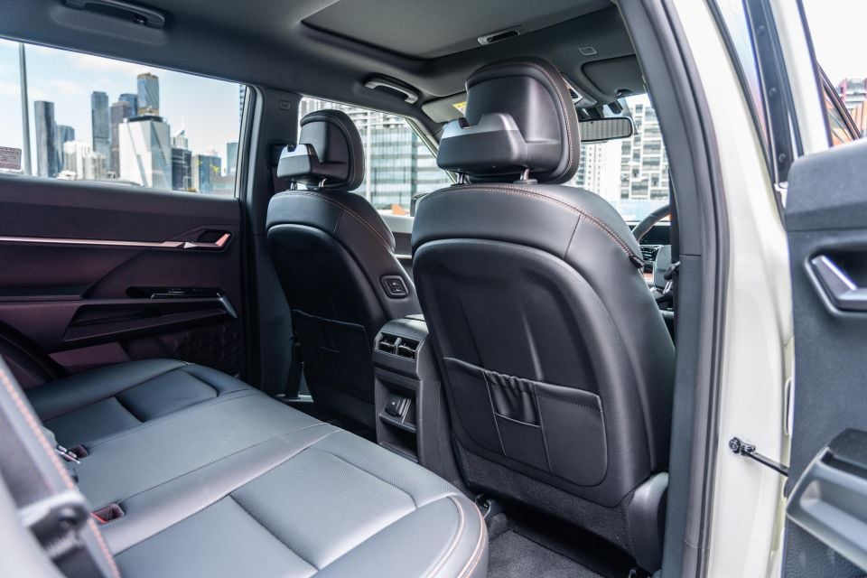 Back here are some quirky amenities. Of course there’s the standard dual USB-C ports and rear-facing air vents, but there are also multi-faceted map pockets on the scratchy plastic front seat-backs, multiple cut-outs on the centre console, and strange appendages on the front head restraints – the purpose of the latter we’re not quite sure of.