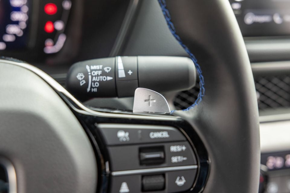 The biggest talking point is the transmission – technically, there isn’t one. Instead, it’s Honda’s direct-drive e-CVT system. However, to combat the ‘rubber band’ feel and create driver engagement, Honda has engineered the ‘S+ Shift’ system. Equipped with steering wheel-mounted paddles, this system emulates an eight-speed automatic transmission.